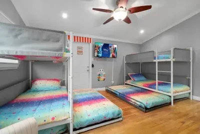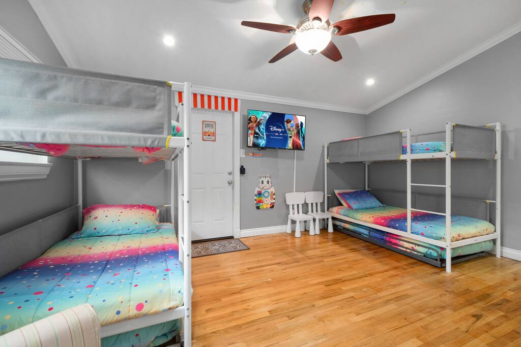 ✔ Two Bunk Beds (Twin over Twin) + Trundle Bed—ideal for kids or young-at-heart guests
