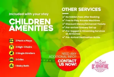 ✔ Toddler Amenities (1 Cribs, High Chair, 2 Strollers, and 2 Pack n Play)
