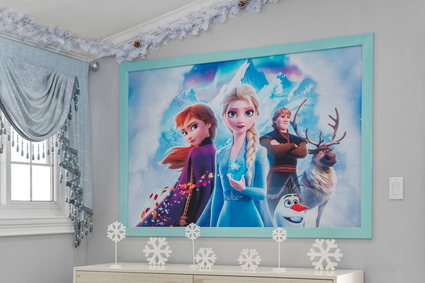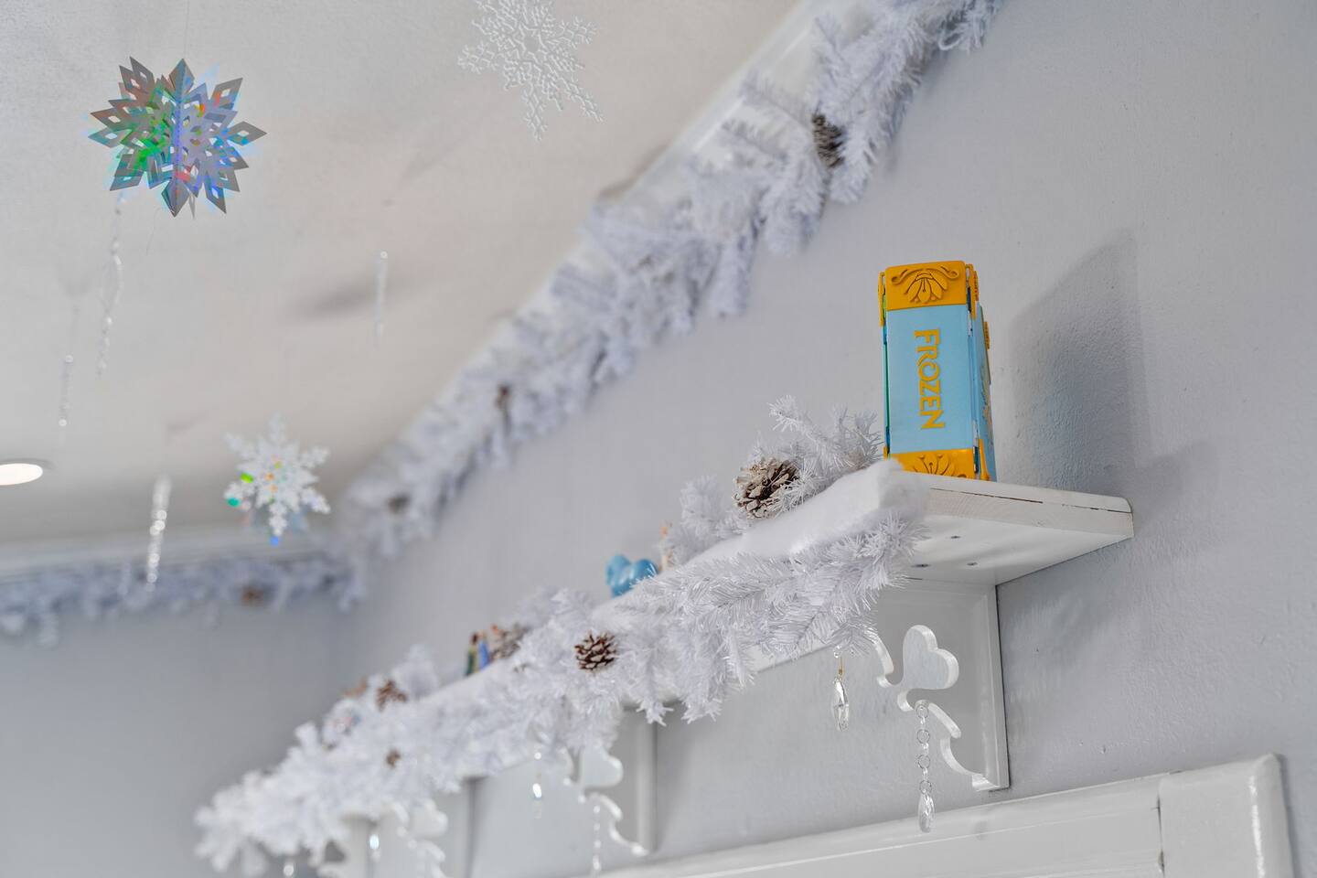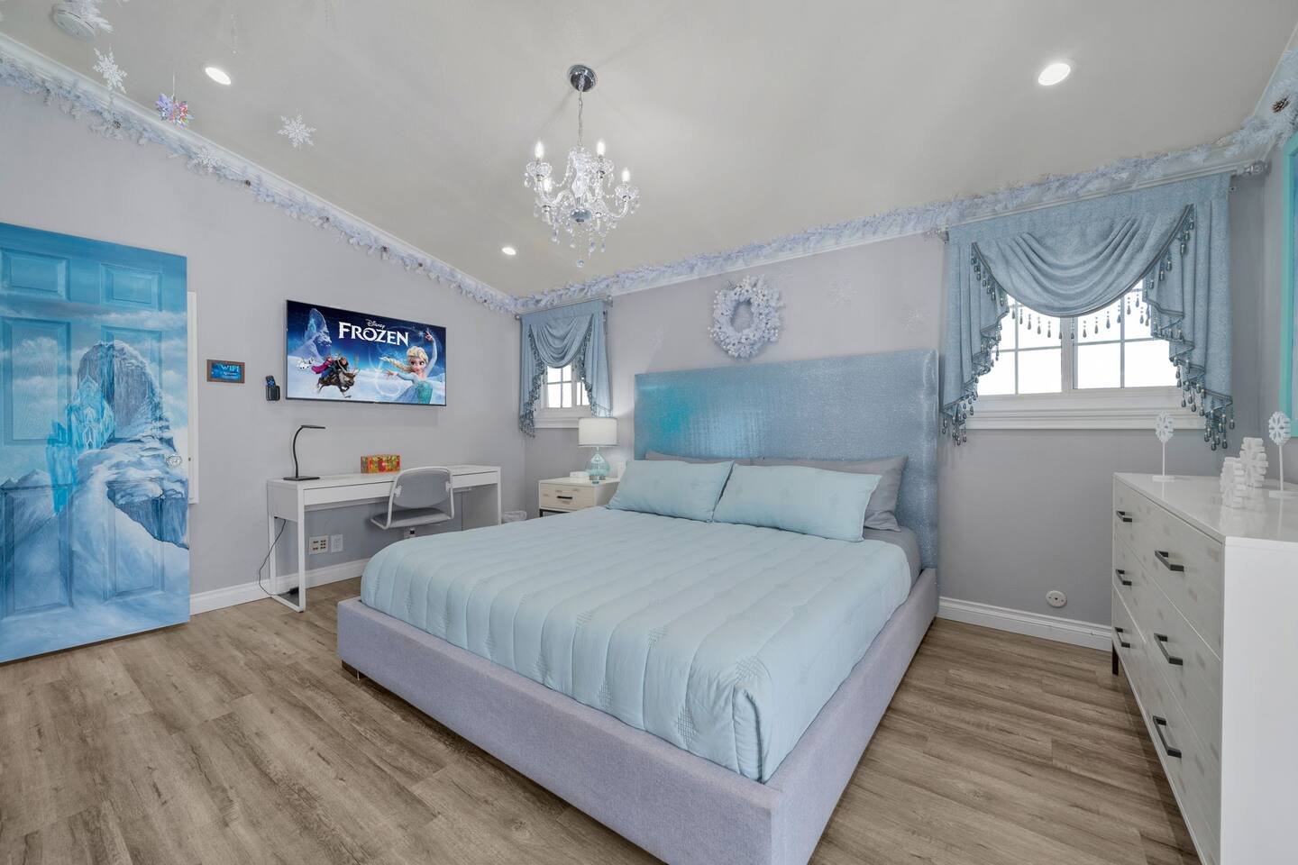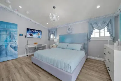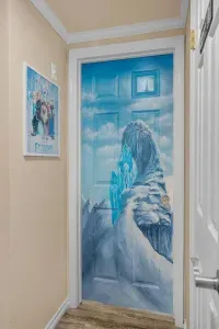 Step into Elsa’s icy retreat, where shimmering accents and soft, snowy hues invite you to unwind after a magical day.