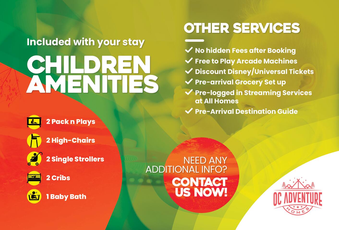 โ Toddler Amenities (2 Cribs, 2 High Chair, 3 Strollers, and 2 Pack n Play)
