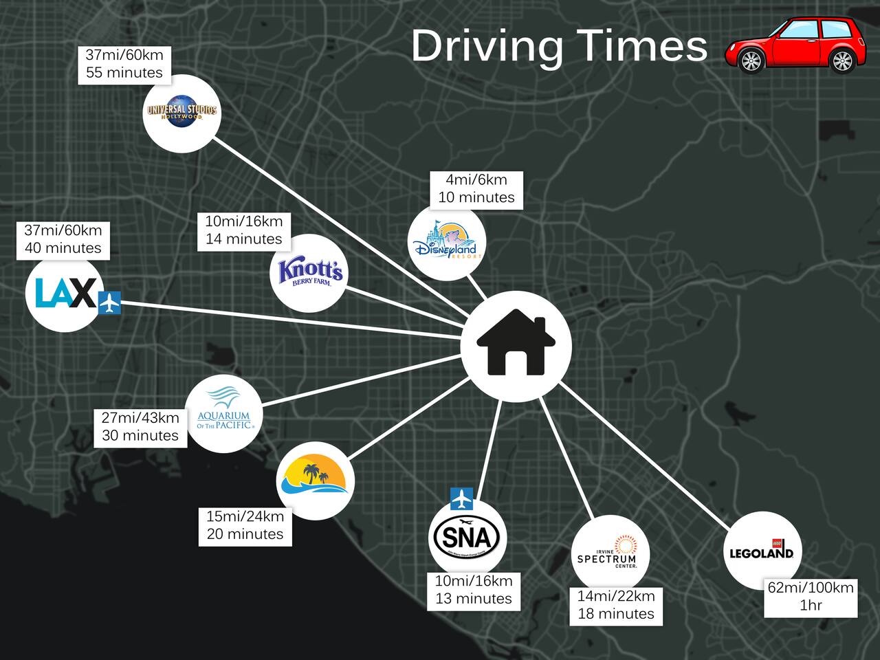 Our homes are conveniently located within a short drive to Disneyland, typically ranging from 2 to 14 minutes. We recommend choosing the theme that excites you the most, as the drive time will be minimal compared to the lasting memories you'll create during your stay.