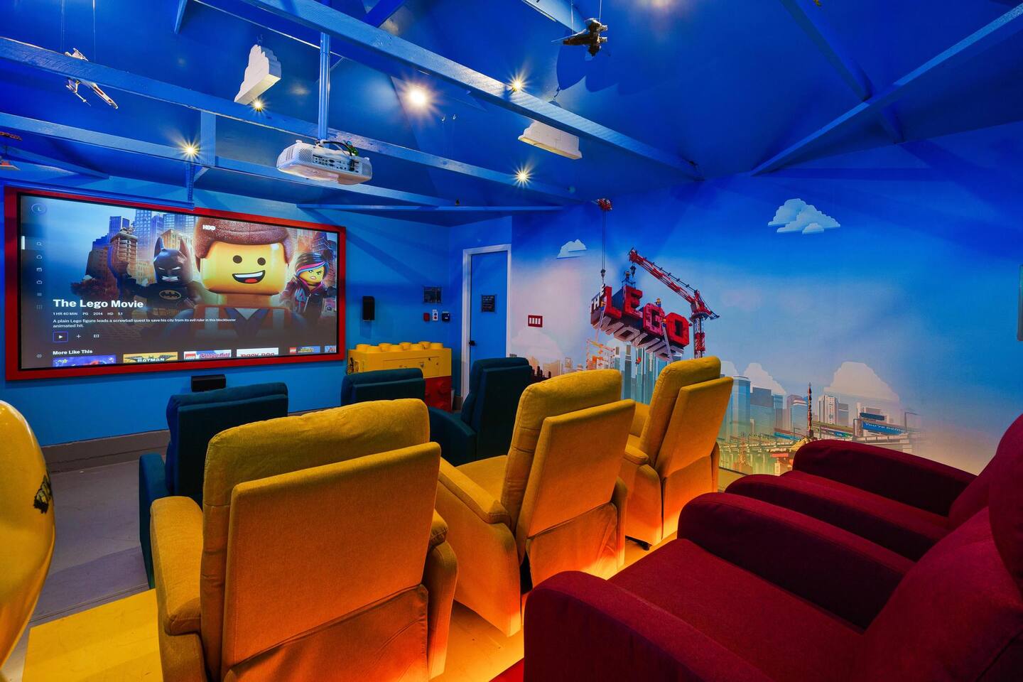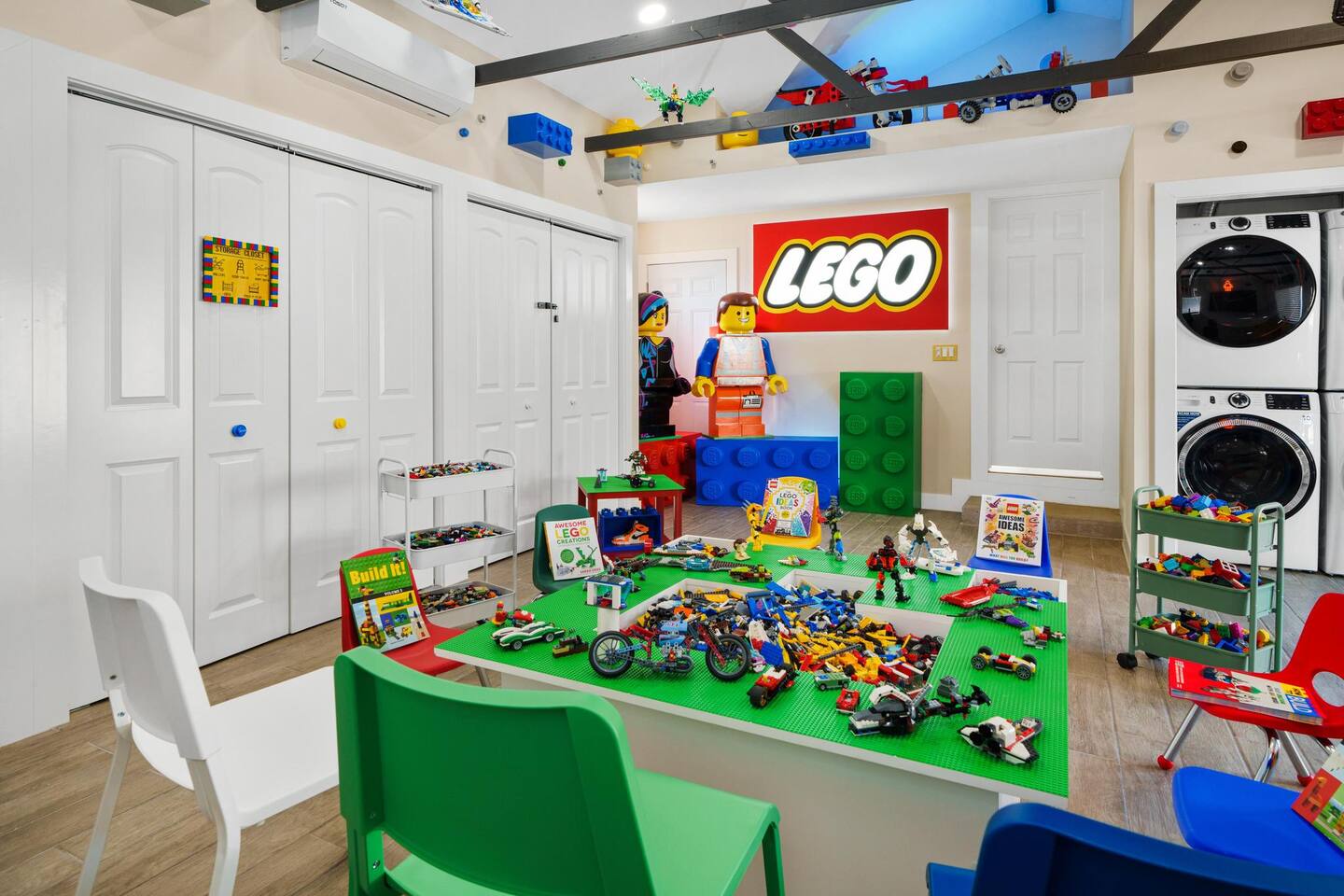 Gather in the open-design living area to enjoy a movie night surrounded by LEGO sets, challenge each other to a LEGO building contest in the playroom, or splash around in the heated pool while the kids race their creations on the LEGO ramp! 🎲 The fun never stops at this playful retreat—complete with a private theater, arcade, and backyard playground for even more adventure! ✨🌟
