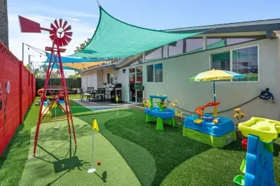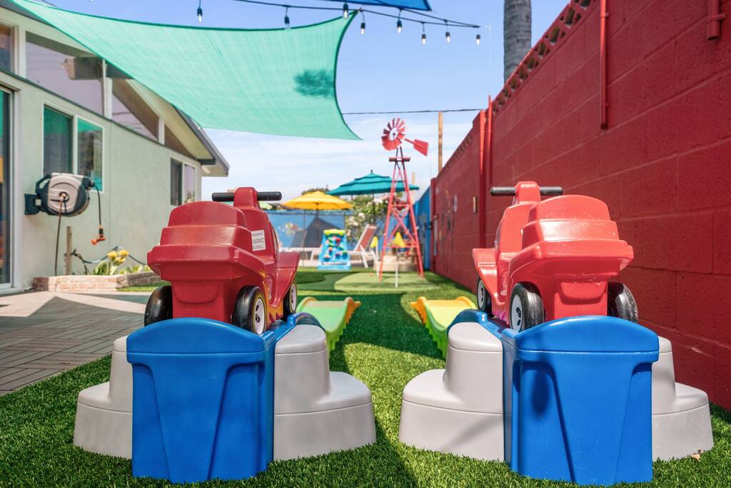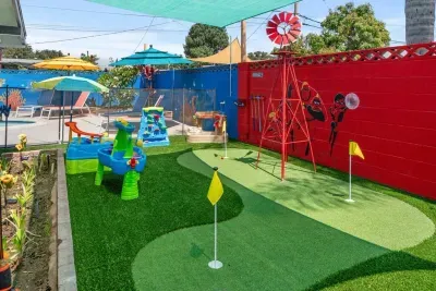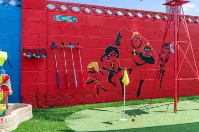 The backyard is filled with fun activities for the whole family! 🏝️ Cool off in the Finding Nemo heated pool, test your putting skills at the mini-golf course, or take on the Incredibles Playground, complete with water tables, teeter-totters, and more for endless outdoor fun! 🌞⛳