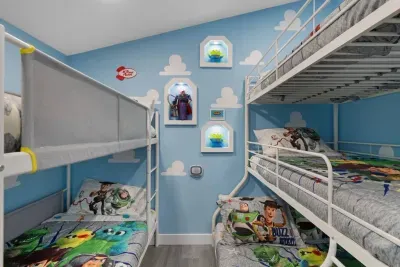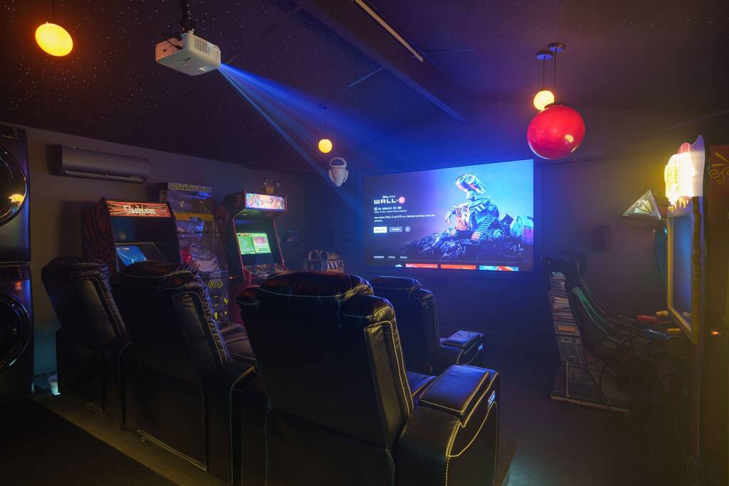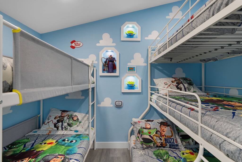 Gather in the Coco-themed living room to relax, play games, and share stories of your Disney adventures. Enjoy a delicious meal in the Ratatouille kitchen, where the chef’s touch and a sprinkle of Pixar magic make every dish a delight. Then, settle down in one of four beautifully designed bedrooms—each offering a unique Pixar experience—before venturing into the space-themed movie theater for a night of animated classics and friendly competition in the arcade! 🌟