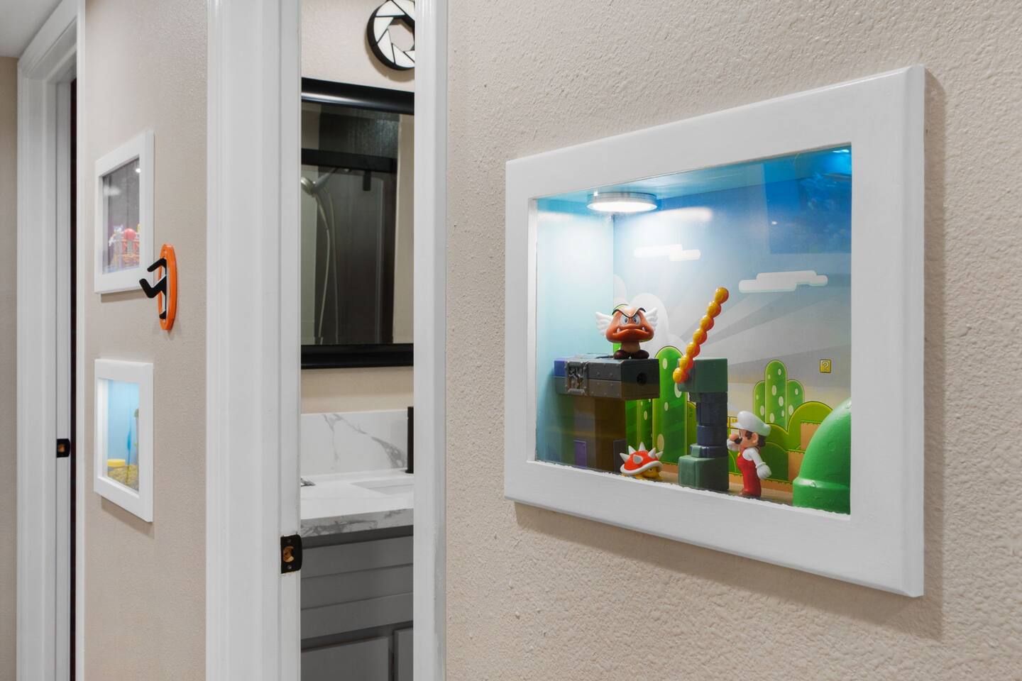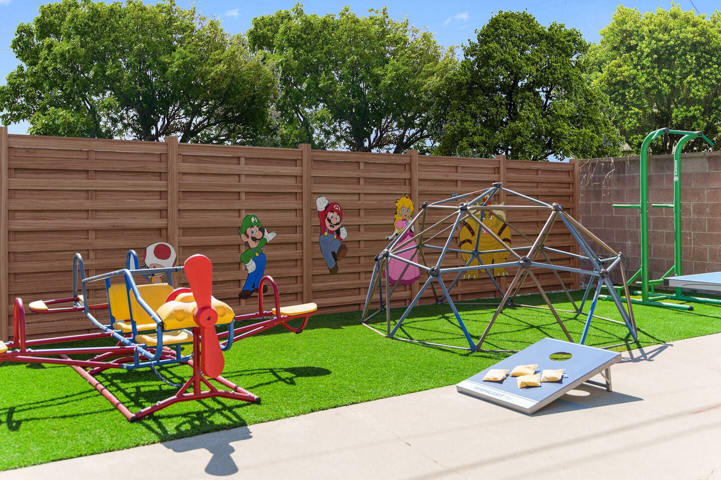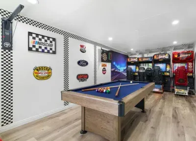 Start your journey in the gaming-themed living room, relax in one of three playful bedrooms, then make your way into the Mario-themed movie theater & arcade for a cinematic gaming experience. Outside, the backyard is filled with fun, from the playground to lawn games, making this a true gamer’s paradise! 🕹️✨