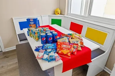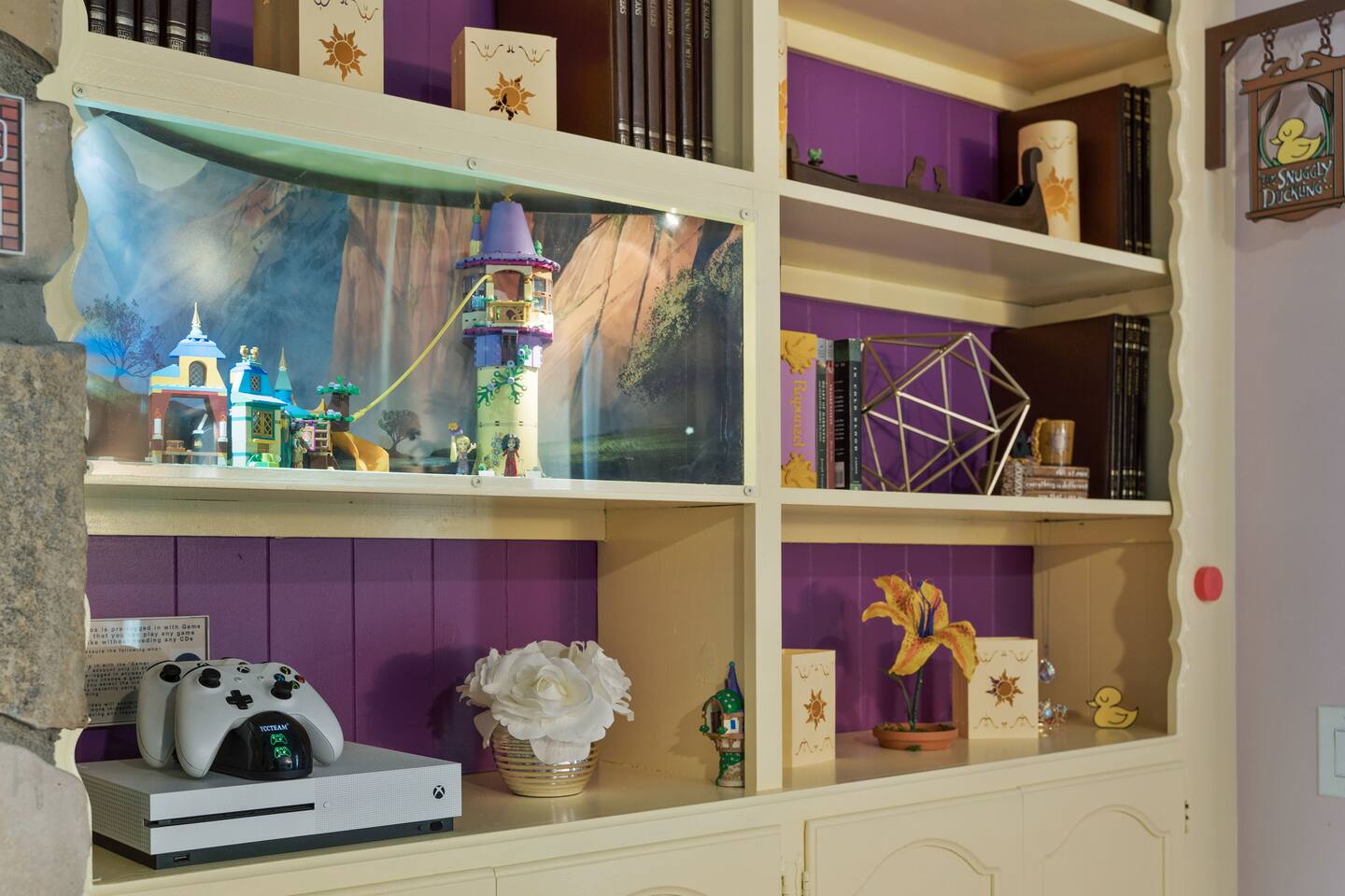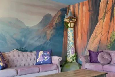 Welcome to the heart of the palace—the Royal Parlor, where Rapunzel’s world unfolds in a Tangled-inspired living area! 🌸🌿 Bathed in the warm glow of floating lanterns, this room features a lifesize replica of Rapunzel’s tower, casting an enchanting light as you relax on plush seating surrounded by the princess’s signature artistic touches. The perfect space for family gatherings, movie nights, or gaming marathons, it’s a place where adventures come to life and royal memories are made. 🌟